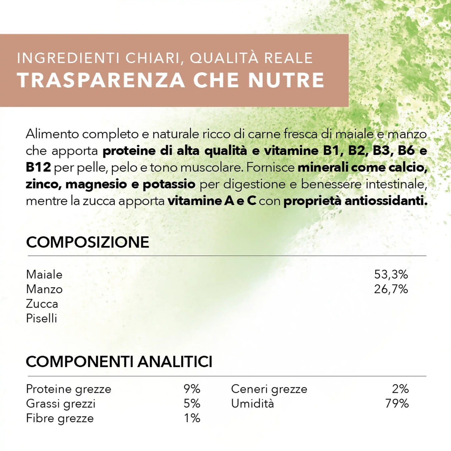 Componenti analitici: Proteine grezze 9% · Grassi grezzi 5% · Fibre grezze 1% · Ceneri grezze 2% · Umidità 79% · Energia metabolizzabile 87,5 kcal/100 g.