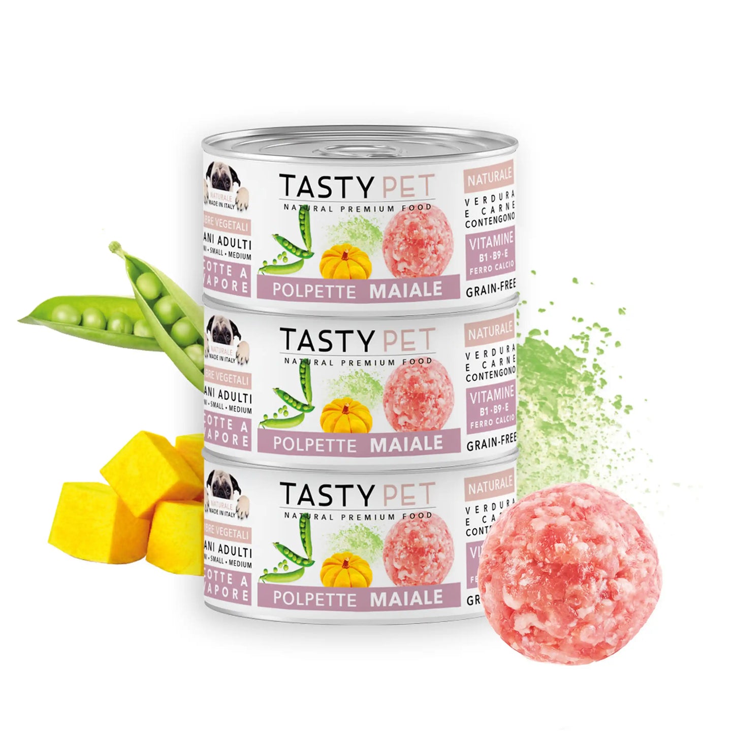 TASTY.PET Polpette MAIALE ZUCCA e PISELLI al sugo - Alimento Completo Umido per Cani