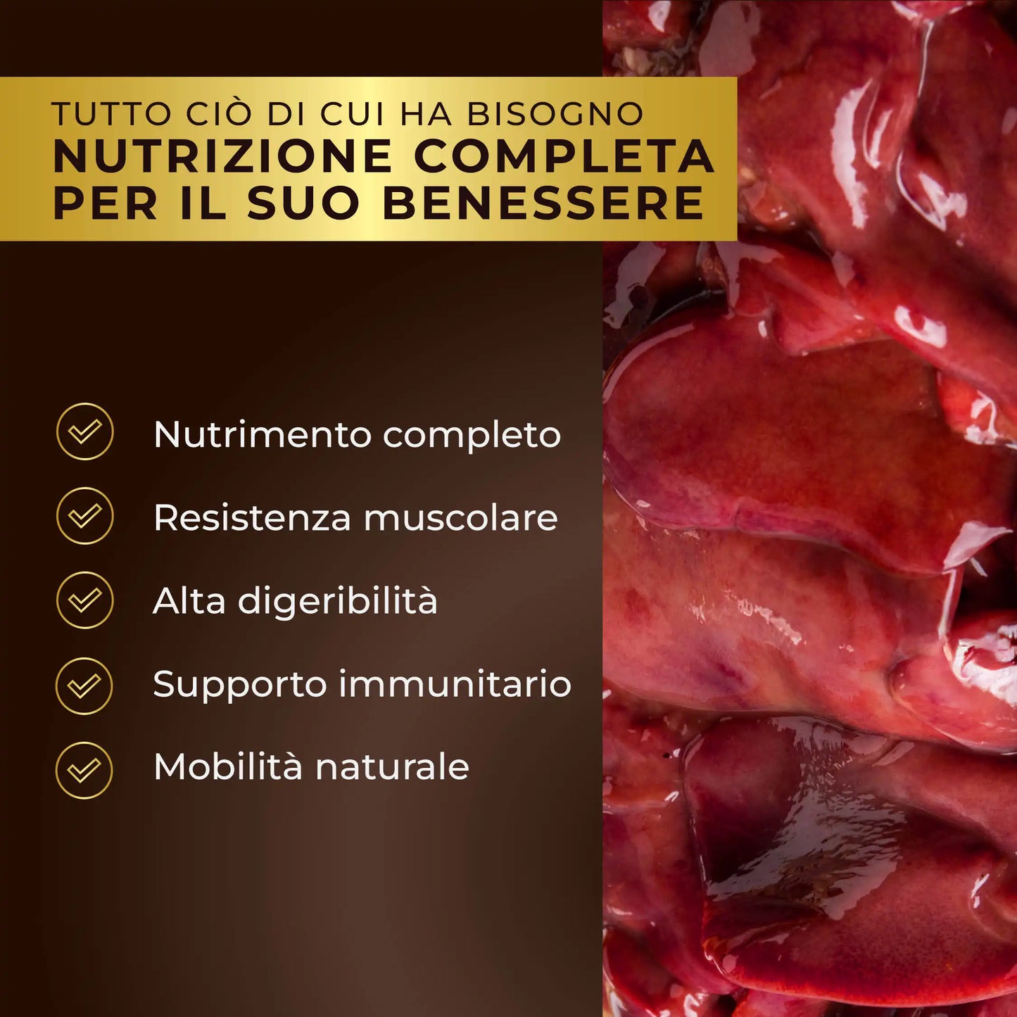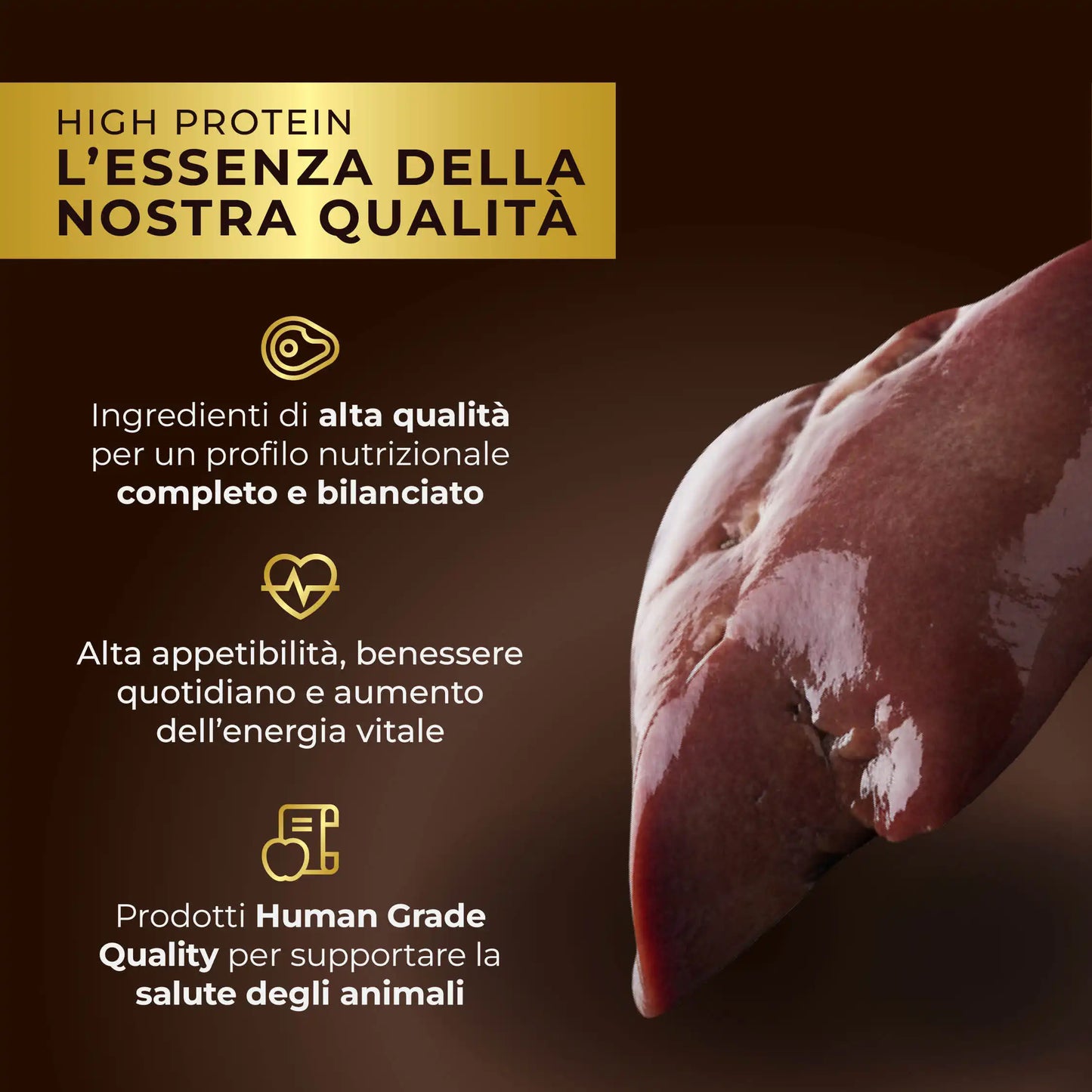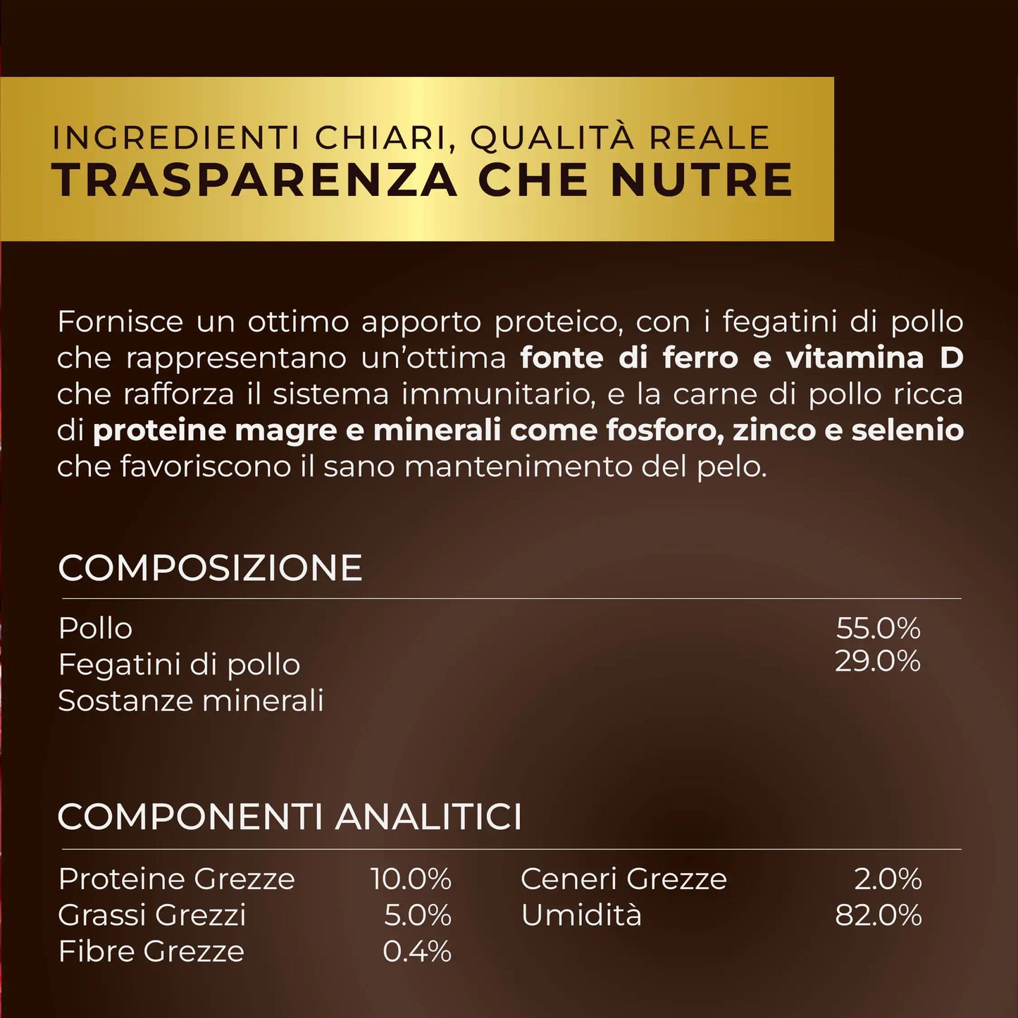 It provides an excellent source of protein, with chicken livers being a great source of iron and vitamin D, which strengthens the immune system, and chicken meat being rich in lean protein and minerals such as phosphorus, zinc, and selenium, which promote healthy coat maintenance. A natural and balanced recipe with no artificial colors or preservatives.