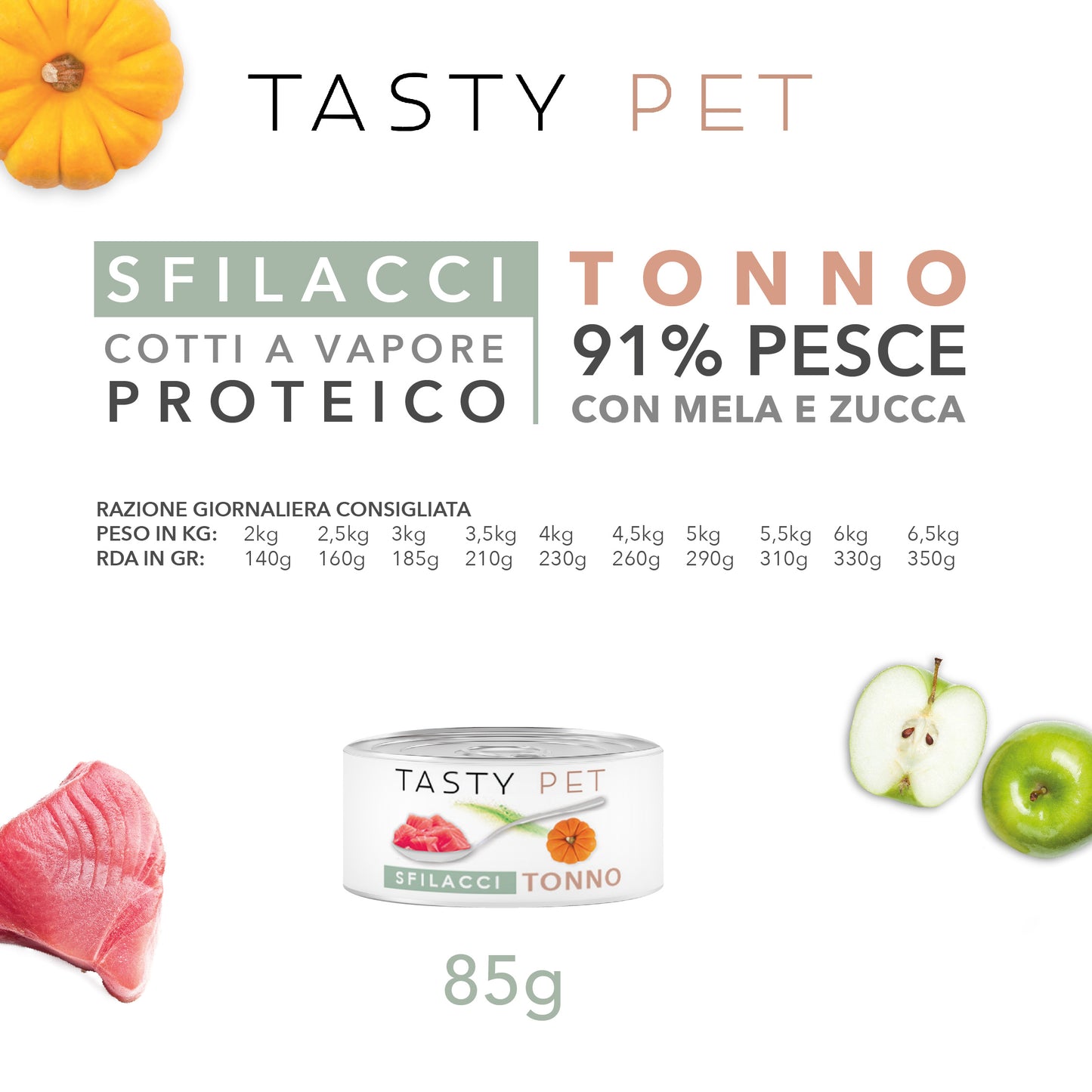 Tuna 91%, apple 4%, pumpkin 4%, rice.