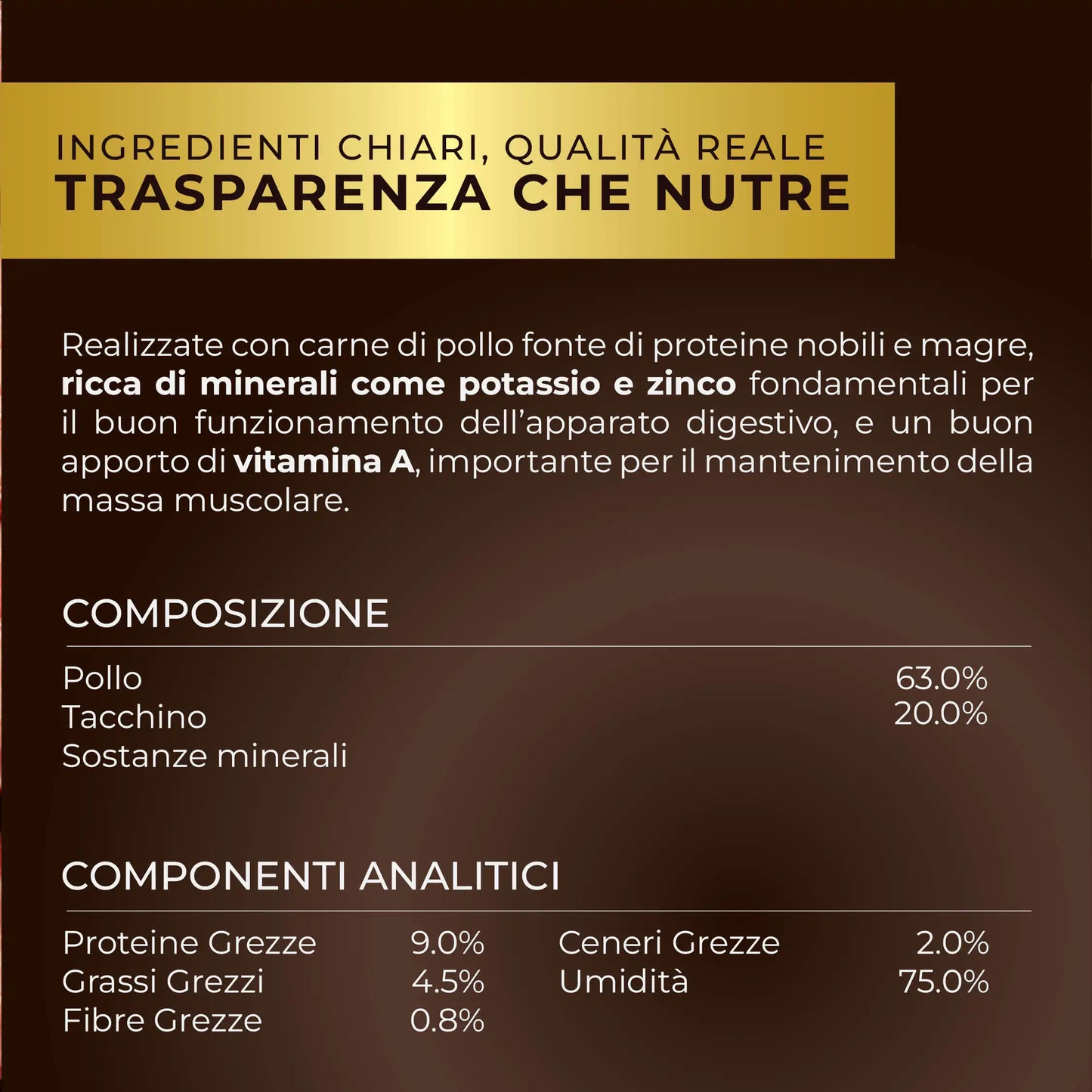 Made with chicken meat, a source of lean protein, rich in minerals such as potassium and zinc, which are essential for the proper functioning of the digestive system, and a good supply of vitamin A, which is important for maintaining muscle mass.
