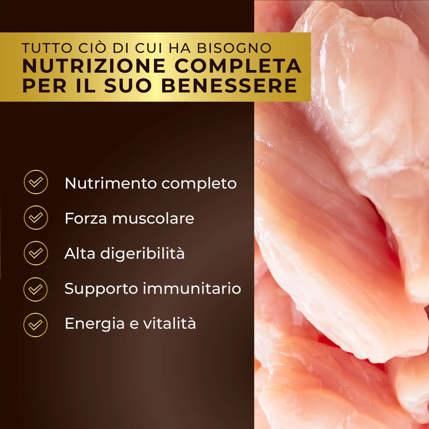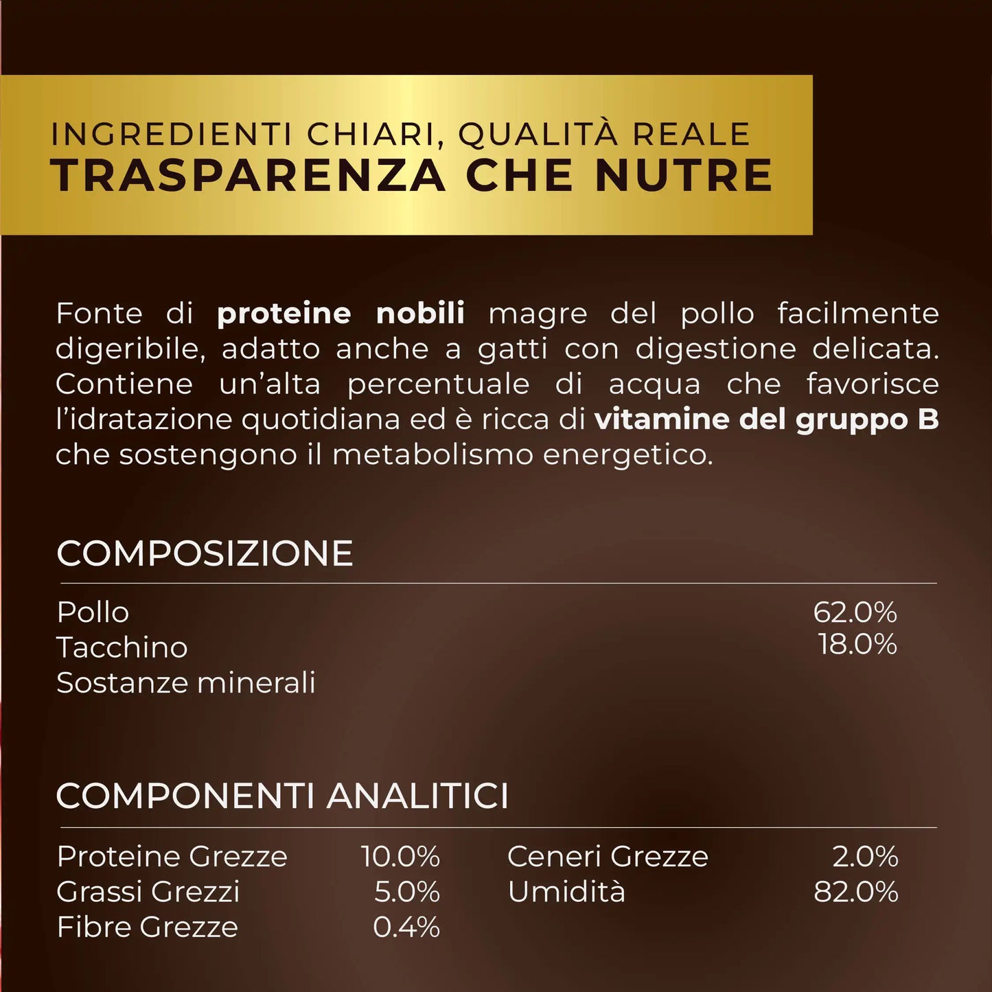 A source of easily digestible lean chicken protein, also suitable for cats with sensitive digestion. It contains a high percentage of water, which promotes daily hydration, and is rich in B vitamins that support energy metabolism.