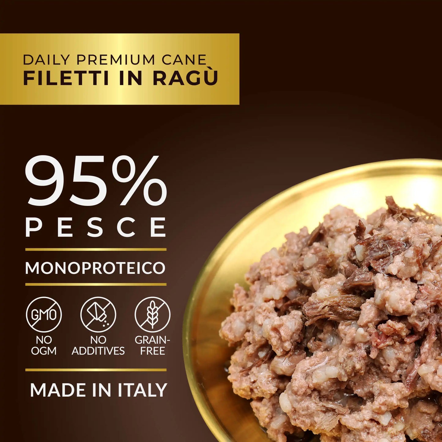 WUSTO Fillets in Ragù WHITE FISH 95% Fish - Complete Wet Food for Dogs