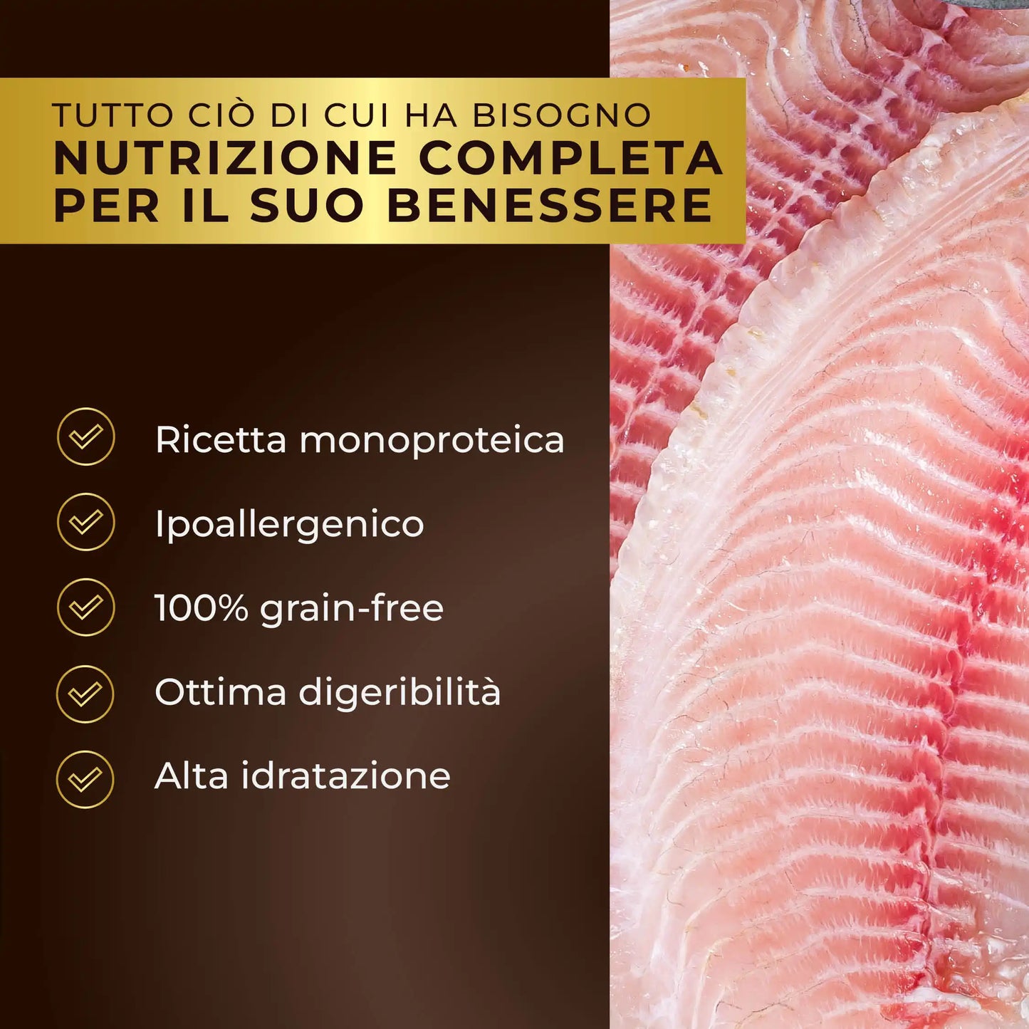 Single-protein recipe with only white fish, cod, and sea bream, sources of high-quality, easily digestible protein with an excellent Omega 3 fatty acid profile, ideal for reducing the risk of food intolerances or allergies and for maintaining muscle mass. The naturally occurring minerals such as phosphorus and sodium help regulate energy metabolism and water balance.