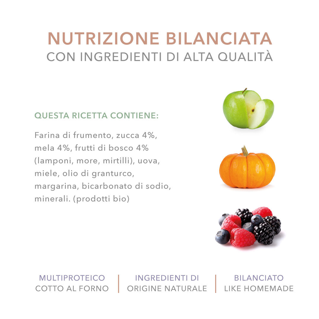Wheat flour, pumpkin 4%, apple 4%, berries 4% (raspberries, blackberries, blueberries), eggs, honey, corn oil, margarine, sodium bicarbonate, minerals. (organic products)
